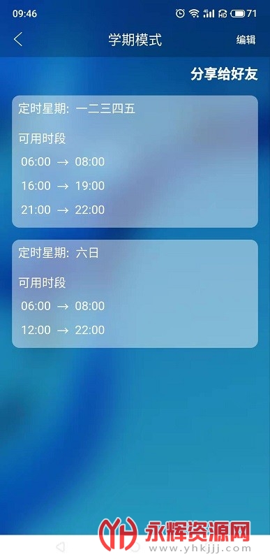 “手机使用时刻表”模板可以设置多个以适应假日等特别日期的使用需求,也可以通过分享采用他人推荐的模板,如年级老师规定的使用模板等。