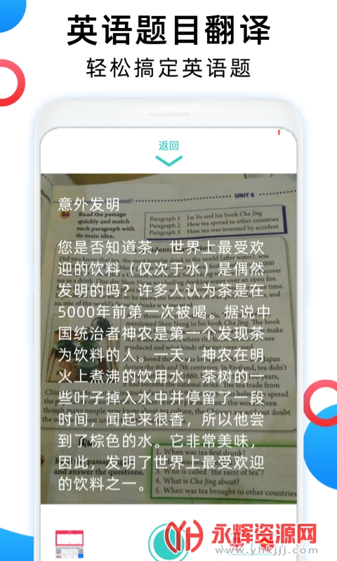 3.英语翻译软件还可以实现拍照翻译,真正的方便用户使用。点击拍照翻译,对准想要翻译的文章图片,即可自动识别语言,进行翻译成中文,也可以选择翻译为其他外语语种!