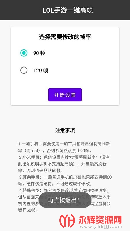 LOL手游一键高帧1.4是为喜欢玩lol手游的宝贝们提供的辅助工具,使用这款软件可以一键将游戏帧率修改为90帧或者120帧,让你玩游戏更加流畅。有需要的朋友们可以来永辉资源网下载使用哦!