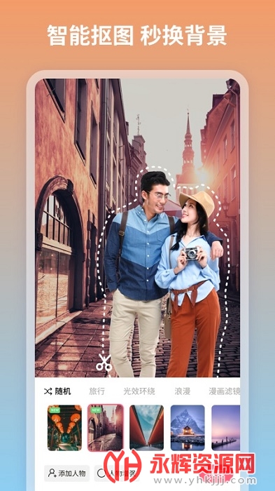 Al智能可以自动识别并抠出照片中的人物,让您轻松换背景图。提供了海量背景图,包含自然风景、知名景点、趣味照片等。