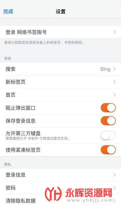 3. 支持以下13个功能:阅读模式,夜晚模式,无图片省流量模式;隐私标签页,网络书签同步,自定义主页,自定义及添加搜索引擎,屏蔽弹出窗口,保存登录密码,允许第三方键盘,标签页总预览界面可变为小或大,支持touch id和密码,清空历史及隐私数据。