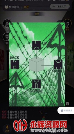 大门开关下有一排图形都只有一半,不能忽视这些图形,他们是解密关键所在第一个是五边形5 第二个是三角形3第三个是四边形.4,第四个是六边形6所以图形表示5346,根据刚才的方向理解,小丑的开关方向要按照这几个图形的顺序排列,所以是5(下)3(上)4(左)6(右)小丑屋门大开。