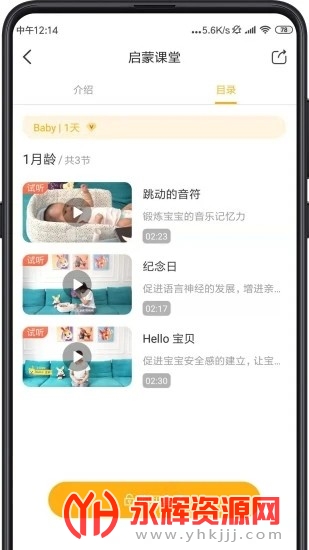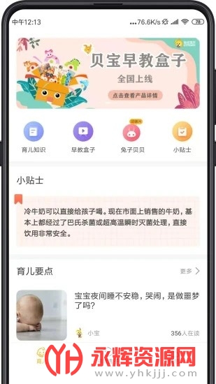 3、涵盖动画儿歌、经典故事、辅食及育儿知识、父母课堂、疫苗提醒、成长测评等,帮助宝宝家庭一站式解决育儿难题。