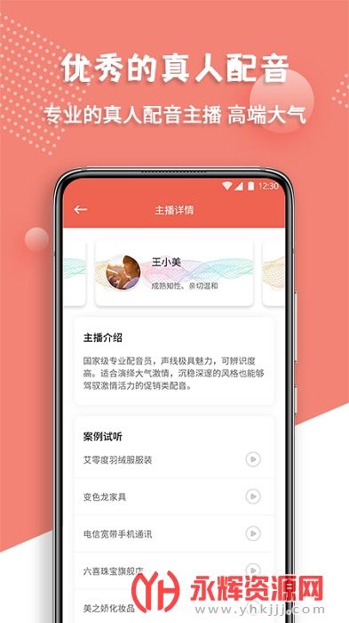 配音王app是一款非常实用的手机配音软件,软件上主要有量大配音功能,分别是智能文字转语音配音和真人配音,并且支持多种智能配音角色,还有着丰富的配音素材资源,用户们可以任意的挑选使用,轻松一键生成各种语音配音效果!感兴趣的朋友们就来下载体验吧!