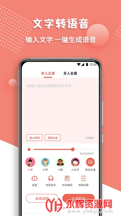 智能语音合成:粘贴或输入需要转换的文字,选择自己喜欢的主播,添加背景音乐,设置语速,一键合成语音配音,适用于地摊叫卖、广告促销、商场宣传活动合成配音。