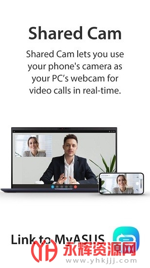 将您的行动装置做为您电脑的摄影机。您只需在PC视讯软体中选择“LinktoMyASUS-SharedCam”作为相机,即可轻松无缝共享摄影机。