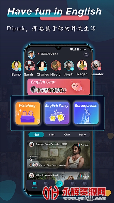 外文在线Diptok是一款集英语新社交、一起看美剧、在线英语论坛、英语短视频等沉浸式泛娱乐英语练习APP,为中国英语爱好者搭建一个全新纯英文娱乐社区平台。