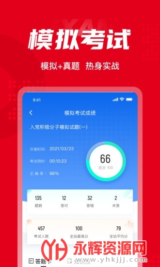 入党积极分子题库内含考点练习,全国通用卷以及地区卷模拟练习,以及按照固定考试比重的随机式的抽题的真题考场,成绩单实时记录考试数据,一点一滴的反馈考生近期学习状态以及自我正确率的提升,给予考生通过考试的信心。