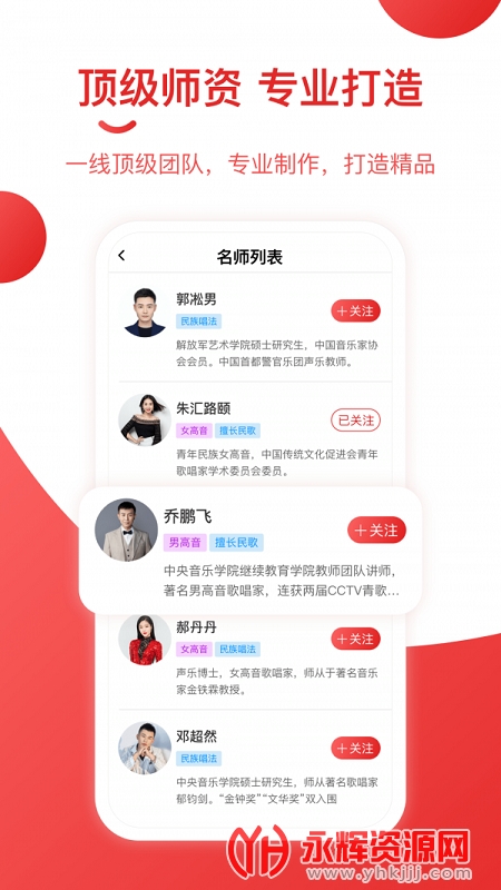 平台师资:由中央音乐学院继续教育学院孔聪院长率研发团队自主研发,包括多名一线音乐制作人以及多位一级、二级歌唱家。
