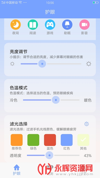 场景应用,通过夜间,阅读,游戏,助眠,影音等场景模式,调节合适的手机亮度。
