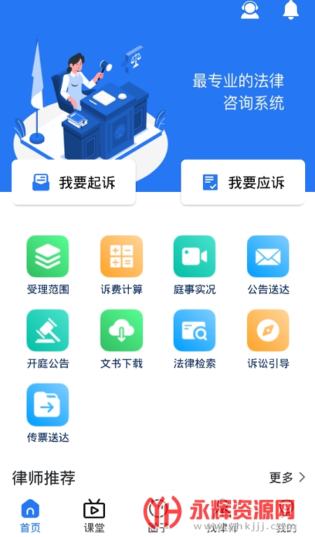 象律师法律服务平台是为广大朋友们提供的法律综合服务软件,在这里你可以学习到许多专业的法律相关小知识,还能计算出诉讼费用、传达发票等,你还能咨询法律相关的问题,会有专业的律师为你进行解答。有需要的朋友们快来永辉资源网下载吧!
