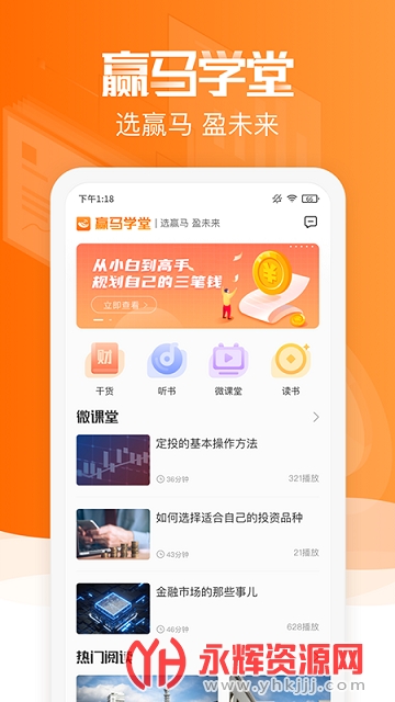 赢马学堂是一款非常专业的掌上教育教学手机软件,软件专门为金融财会方面专业或者是从业者带来了可靠的优质课程可以随时学习,帮助学生牢固掌握诸多方面的知识点,特别的方便实用,有需要的朋友就快来永辉下载体验吧!