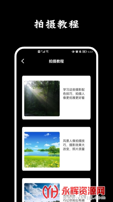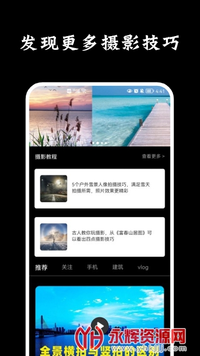 专为摄影师打造的摄影教学软件。它有着非常丰富的摄影教学。我们可以在没有方向的情况下学习摄影。就连小白也可以在这里学到很多摄影知识,帮助大家可以拍很多我们想拍的作品。这里都有教程,还可以结识摄影大咖,交流拍照经验,学习ps,各种特效制作,让你成为摄影达人。