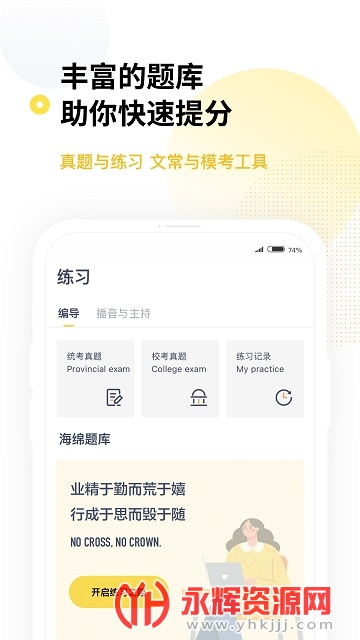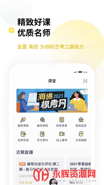 海绵艺考app是一款非常不错的掌上艺考学习手机软件,软件中专门为准备参加艺考的朋友带来了非常多方面的优质课程资源,里面包含的课程类型也是比较的多样,帮助学生在这里提高自己,通过考试,有需要的朋友就快来永辉下载体验吧!