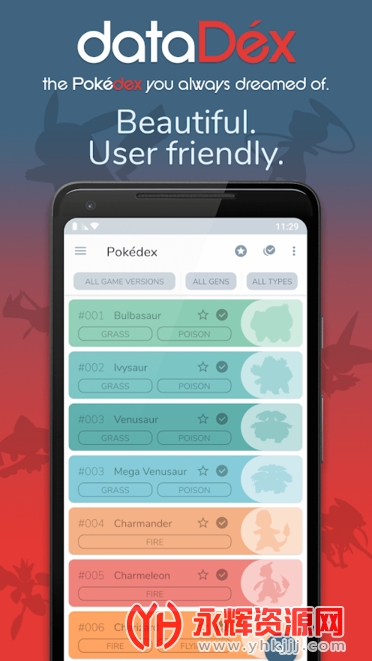 非官方的设计精美的图鉴应用并适合所有的用户使用。它包含了所有721只宝可梦的详细数据!并且包含了所有主要系列的宝可梦游戏!