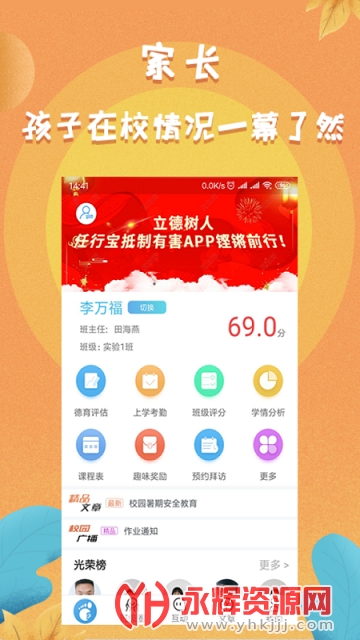 光荣榜:系统自动向老师、家长、学生移动终端呈现学生好人好事,有效宣传榜样行为,促进学生素养和学校文明校风。