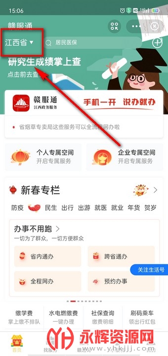 01、打开赣服通app或者在支付宝中搜索“赣服通”选择官方应用进入,切换所在地,并授权登录