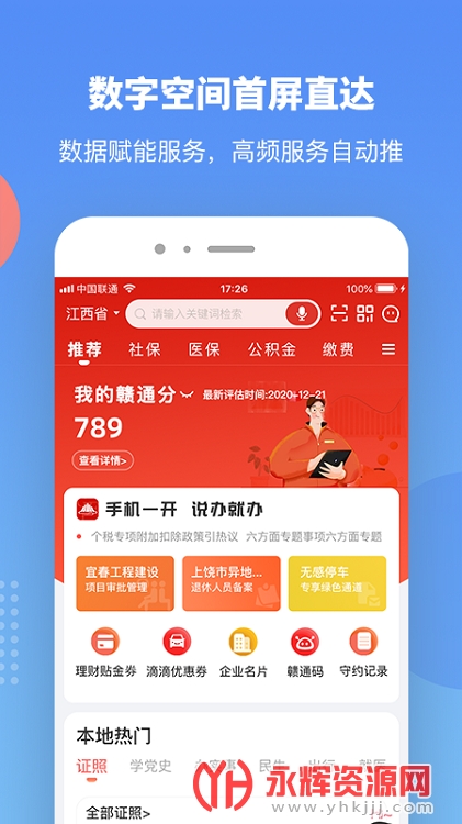 依托电子证照系统可以在线申领查看身份证、驾驶证、社保卡、结婚证、离婚证、律师证等电子证照并能运用到相应办事场景中。通过对接赣南日报、赣州广播电视台移动端还可以浏览阅读最新资讯。