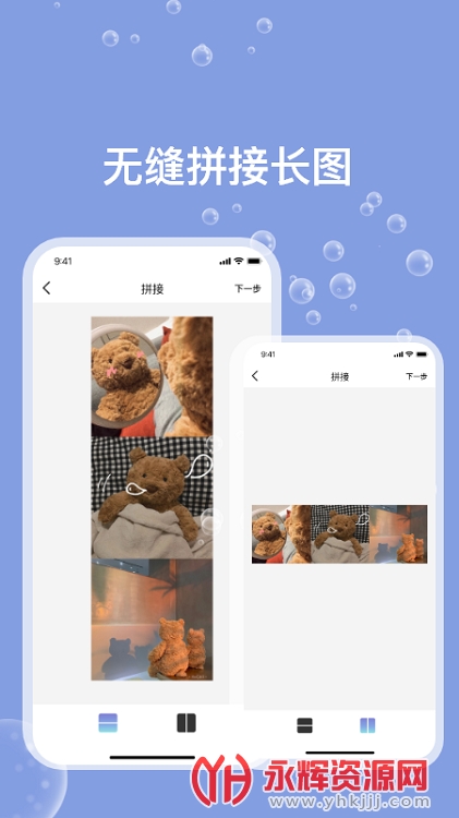 3、需要注意的是,「长截图」仅适用于拼接屏幕快照。对于其他图片,你可以采用「竖向拼接」和「横向拼接」。这两项功能的操作同样很简单。在拼接的页面,选择一条边为基准,按照实际需要拖动图片,裁剪掉不想要的部分,点击保存即可完成拼接。