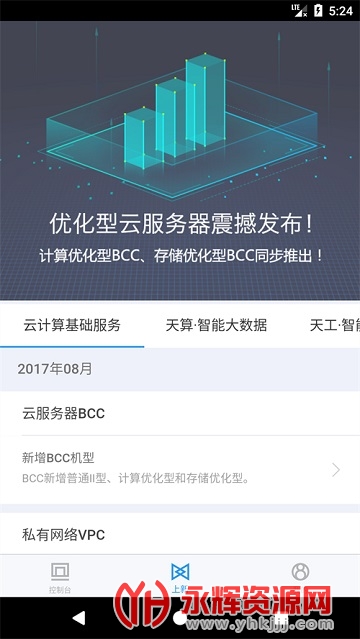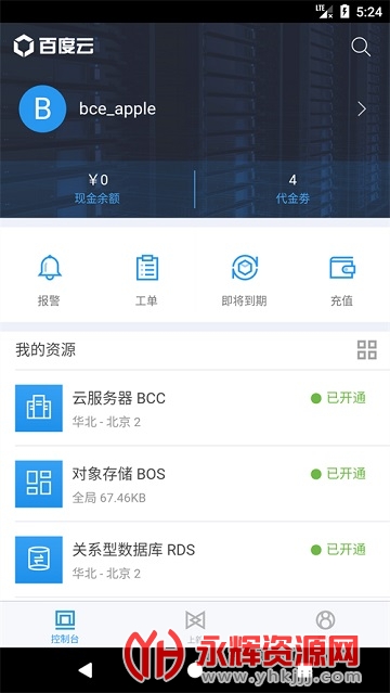可查看帐户、报警、工单、即将过期云产品;还可查看八大主要云产品的开通与否和运行状态。