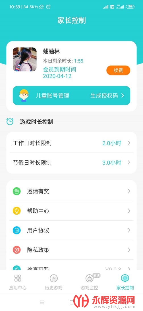 软件分为家长端与儿童端,家长可以智能管理儿童端的在线游戏时间及在线时段,到时自动下线,合理安排儿童的学习生活;
