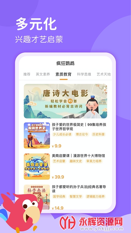 疯狂鹦鹉app是为广大朋友们提供的英语口语学习软件,这里有着超多英语启蒙课程提供给孩子们进行学习,多元化的学习模式能让孩子们爱上学习。有需要的朋友们快来永辉资源网下载吧!