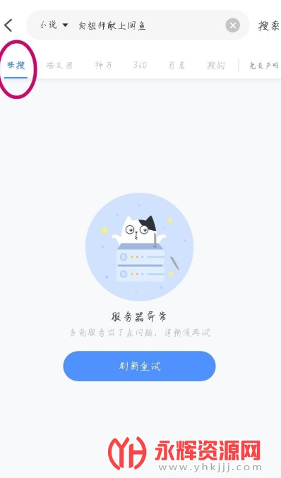 如果在咪搜的区域就会显示无网络,你可以点后面的各大网站就能发现坏坏猫还是能用的