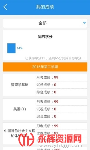 学生随时了解学分获取情况,鼓励学生继续努力,尽快达到毕业总学分。通过“我的成绩”选择相应学期,即可查询出当学期考试总体情况,作业和考试成绩都一目了然,还可查询出自己以往学期课程的历史成绩。