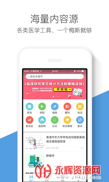 拥有各类医学工具、海量内容源。在首页面有资讯、学院、指南、期刊、会议、医迅达、积分商城等功能选项。