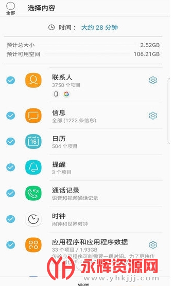 联系人、日历(仅限设备内容)、信息、照片、音乐(仅限无drm的内容、不支持icloud)、视频(仅限无drm的内容)、通话记录、备忘录、闹钟、wlan设置、壁纸、文档,应用程序数据(仅限galaxy设备)和主屏幕布局(仅限galaxy设备)