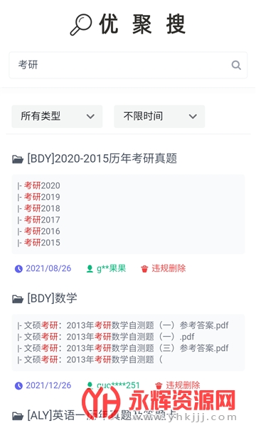 优聚搜是一款网盘专搜app,在优聚搜里面,你可以随时来查询到其他用户上传的各种资源,包括考研、教资、公考、编程等等,平台中各种内容都是应有尽有的,还是比较全面的app,有兴趣的话,欢迎来本站下载优聚搜!
