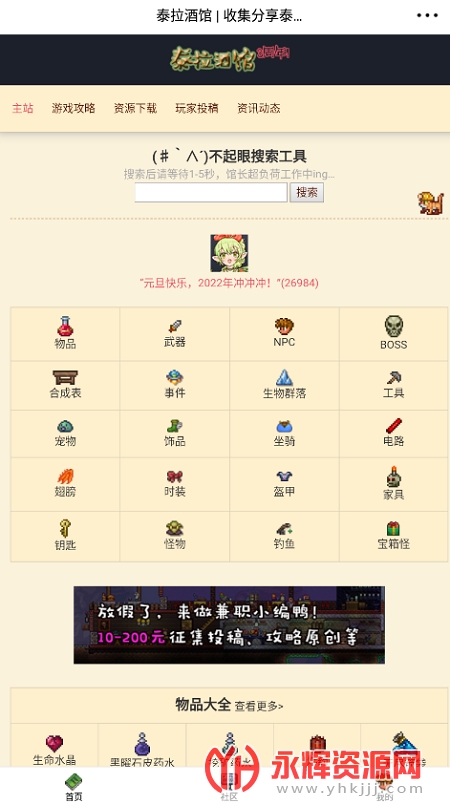 泰拉酒馆app官方版是为喜欢玩泰拉瑞亚游戏的朋友们提供的应用软件,使用这款软件你能查询游戏中的各种物品合成方法,对这款软件感兴趣的朋友们还在等什么呢?快来永辉资源网下载吧!