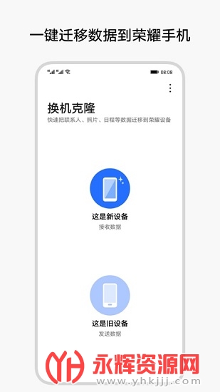 荣耀换机克隆app是一款针对荣耀手机打造的换机克隆辅助工具软件,软件中为用户带来了非常多方面的数据转换克隆迁移等功能,帮助用户在需要换新手机的时候能够不落下任何数据资料,特别的方便实用,有需要的朋友就快来永辉下载体验吧!