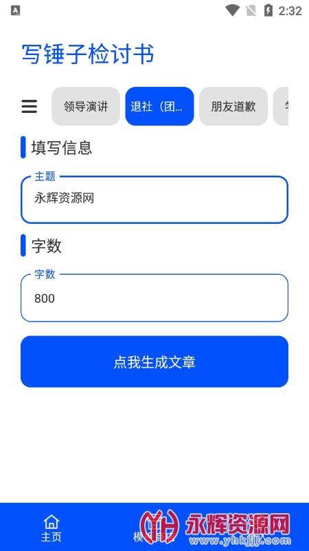 写锤子检讨书生成器app是一款非常好用的检讨书生成工具,使用这款软件输入检讨书的主题以及字数就可以为您自动生成检讨书的内容,非常方便。有需要的朋友们欢迎来永辉资源网下载哦!