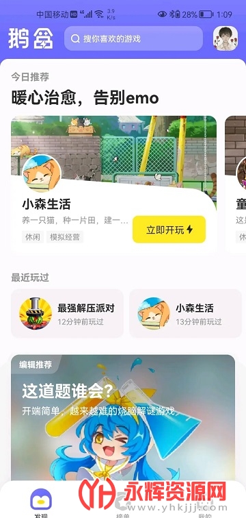 从APP呈现出来的内容来看,入驻“鹅盒”的产品主要由微信小游戏版本移植而来,都是不需下载、即时可玩的小游戏。这一点与接入了众多超休闲、休闲手游的“摸摸鱼”不尽相同,反而与华为应用市场择出快游戏栏目推出的的“花瓣轻游”更为相似。