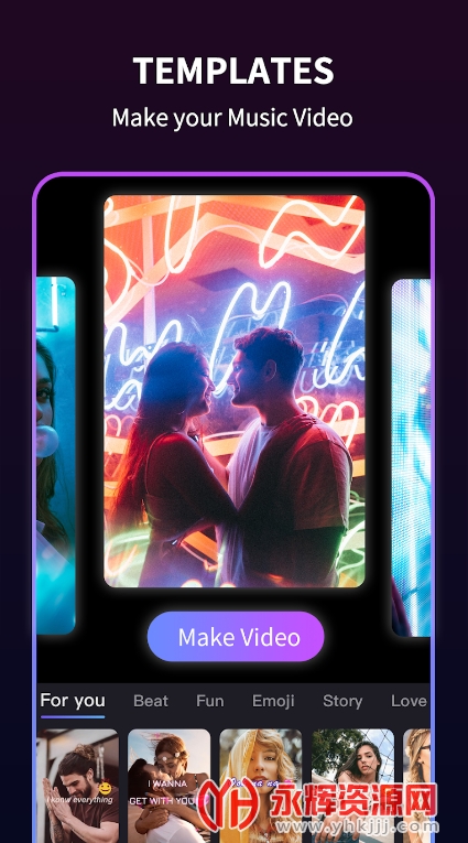 大量具有出色效果 + 过渡的 mv 模板。 - 独特的过渡遵循确切的音乐节奏。