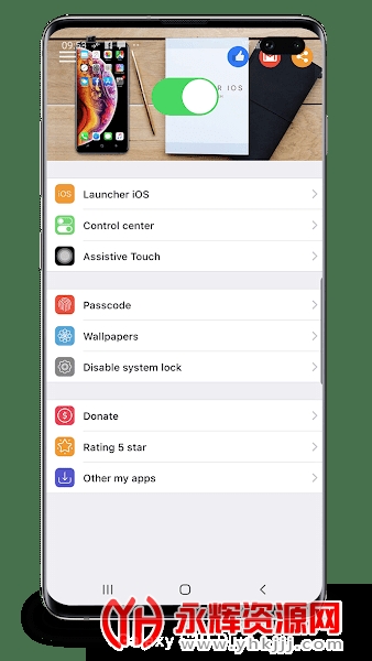1、在本站下载最新版的Launcher iOS 14,然后启动软件,图中从上到下的功能分别是锁屏、控制中心、辅助触控、页面布局、桌面小部件、天气、模糊效果、动画效果、壁纸等等。