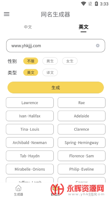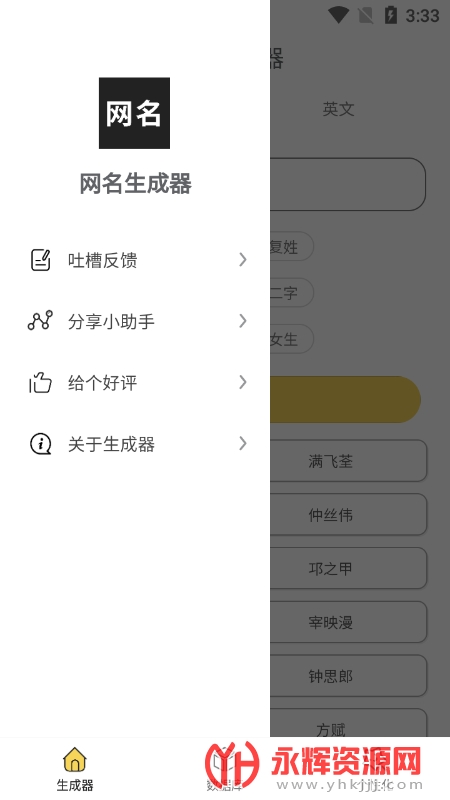 网名生成器app官方版是为广大朋友们提供的网名生成工具,在这款软件中你只需要输入姓氏即可为您免费生成超多网名,并且英文和中文都支持,有喜欢的朋友们欢迎来永辉资源网下载哦!
