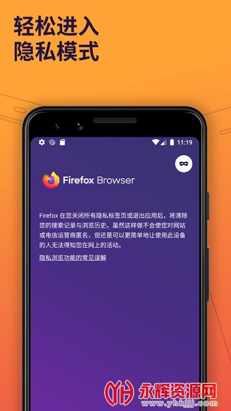 Firefox官方正版apk安装包也就是火狐浏览器,这款软件可以安全智能的保护自己的隐私安全,并且上网速度也是非常快的,有需要的朋友们快来永辉资源网下载吧!