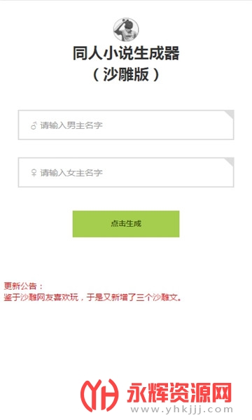 同人文生成app最新版本是一款非常火爆的同文人小说生成工具,使用这款软件你只需要输入男主和女主的名字即可为您一键进行生成,想体验的朋友们别错过了,快来永辉资源网下载吧!