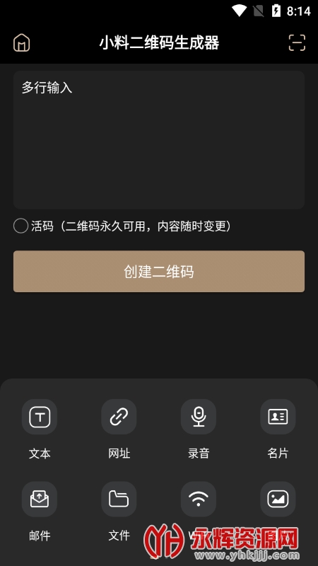 小料二维码生成器破解版最新版本是一款十分简洁好用的掌上二维码生成软件,软件中的功能涵盖十分全面,能提供多种不同文件的二维码生成,有需要的朋友们快来永辉资源网下载吧!