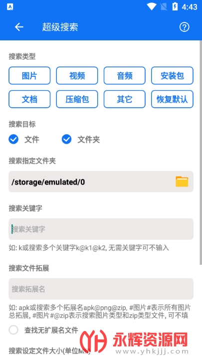 2.超级搜索:根据选定的条件进行搜索,比如文件类型、大小、日期等条件(更多条件请在应用中查看);