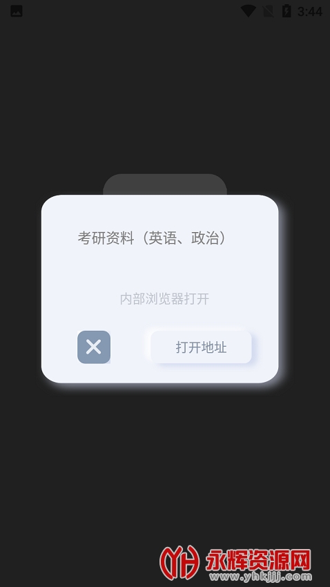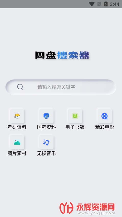 1、软件非常简单,打开后就只有一个首页,可以看见首页有考研资料、国考资料、电子书籍、精彩电影、素材、无损音乐,还可以直接输入关键词进行搜索查找。