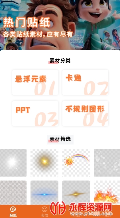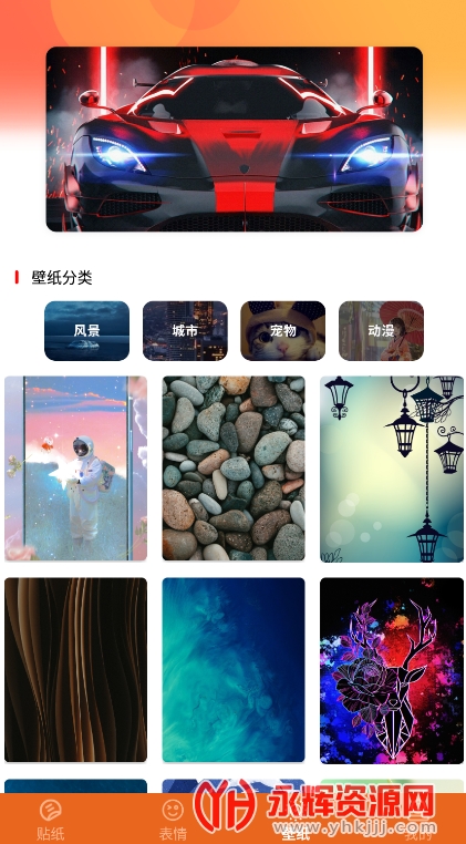 平台主要设置了贴纸、表情包及壁纸三大板块。