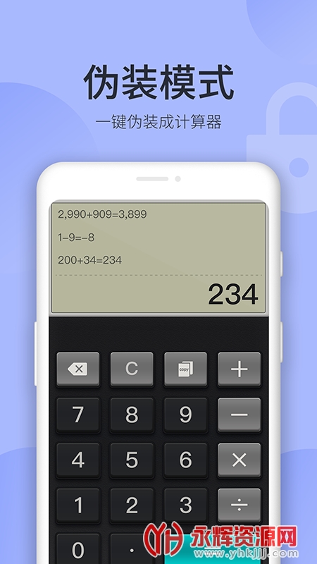 为了防止加密软件删除而导致隐藏失效,还需要对软件进行一下简单的伪装,选择伪装图标设置,可以将软件伪装成计算器、进制转换、或黑洞,以防止被发现,如果需要进入,只需长按左上角的计算器三个字,即可打开隐私空间。