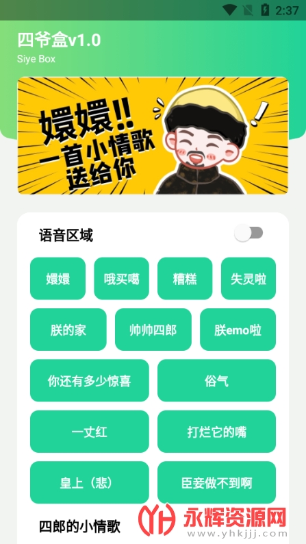 四大爷语音包也就是四爷盒,这是由大神网友制作的语音包软件,相信大家对四大爷再也熟悉不过了,每每听到四大爷都可以为大家带来欢乐,而在四大爷盒中有着超多的语音包资源可以随意播放,更有悬浮窗带来便利,有兴趣的玩家现在就来下载吧!