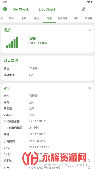 网络:显示有关WiFi和移动/蜂窝连接,其中包括IP地址(IPv4和IPv6),连接信息,运营商,手机号码,电话和网络类型信息;
