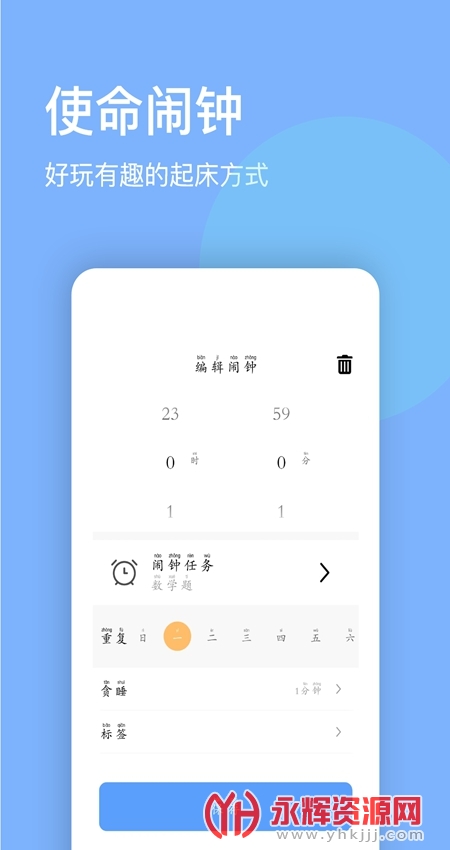 睁眼闹钟app是一款专门为安卓手机用户打造的闹钟软件,在这里提供了非常非常不错的闹钟服务,用户可以自行设置时间,享受到高效便捷的闹钟使用体验,早上起不来让闹钟叫你起床,在这同时还有着秒表等等各类功能,现在就来下载吧!