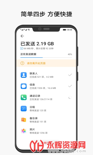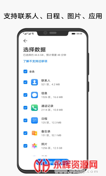 各种数据全都可以迁移,联系人、短信、照片、音乐、视频、应用等