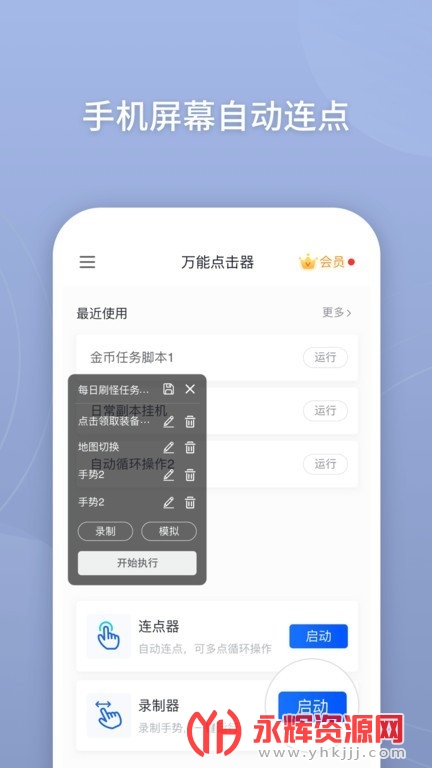 一键设置操作指令,保存点击脚本,下次回来继续使用,为你提供完美的点击效果;